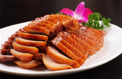 - Thịt vịt xá xíu thái lát rồi xếp ra dĩa, trang trí hoa dưa leo và xà lách, cà chua cùng ít cơm nóng.