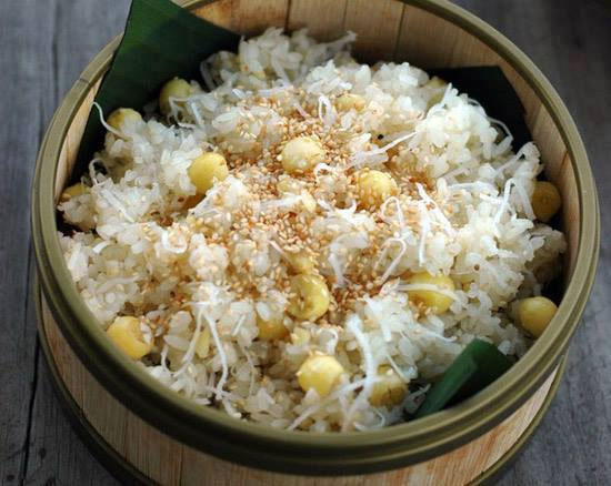 Cách làm: Gạo nếp vo sạch, ngâm 6 tiếng rồi vớt ra rổ cho ráo nước. Hạt sen luộc chín tới với 1 nhúm muối nhỏ. Dừa nạo thêm 1 thìa canh đường trộn thật đều, để 30 phút rồi đem xào với lửa thật nhỏ đến khi sợi dừa trong.