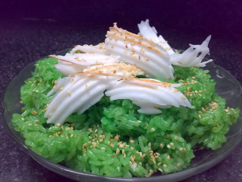 Cách làm: Gạo nếp vò sạch. Lá dừa rửa sạch, thái nhỏ, đem xay với ít nước lọc cho nhuyễn. Lược bỏ xác lấy nước, giữ lại một bát nhỏ, còn lại đem ngâm gạo nếp 8 - 10 tiếng. Sau đó đổ xôi cho chín mềm. Vừng rang chín, giã giập.