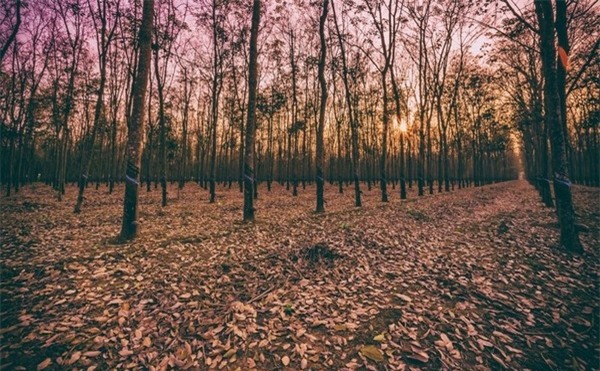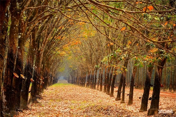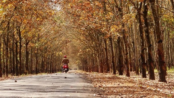 Một lựa chọn khác cho những bạn trẻ yêu khám phá và thiết tha muốn trải nghiệm mùa thu vàng giữa Việt Nam - hãy tìm ghé rừng cao su mùa thay lá. Cây cao su thường được trồng thành những hàng thẳng tắp, tạo nên một khung cảnh đẹp như tranh khi cả khu rừng cùng hoà vào một sắc vàng đỏ ấm áp của mùa thu. Trên trời là những tán lá đã chuyển dần sang cam, còn dưới mặt đất là một lớp lá khô vàng úa, càng khiến khung cảnh trở nên rực rỡ, thơ mộng. Một vài địa điểm có thể kể đến ở đây là rừng cao su Gia Lai, Bình Dương, Đồng Nai…