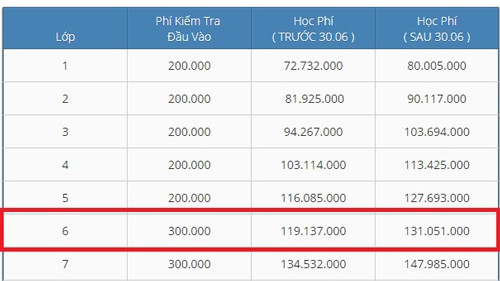 Học phí lớp 10 bán trú là 13.657.000 đồng mỗi tháng, gồm chương trình tiếng Việt và quốc tế; sinh hoạt vui chơi, học tập dã ngoại, câu lạc bộ, hoạt động thể thao. Phí xét tuyển 1,9 triệu đồng; tiền ăn 2,9 triệu đồng mỗi tháng.