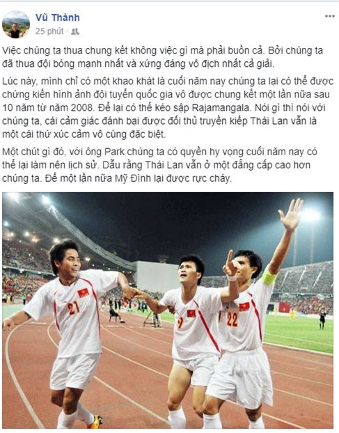 .Trước khi thầy trò HLV Park Hang-seo đáp máy bay xuống sân bay nội bài, nhiều người đã chia sẻ về cảm xúc tuyển U23 đạt được. Facebook Vũ Thành viết: "Việc chung ta thua chung kết không việc gì mà phải buồn cả. Bởi chúng ta đã thua đội bóng mạnh nhất và xứng đáng vô địch nhất cả giải...". Chủ nhân Facebook này cũng hi vọng: "... Với ông Park chúng ta có quyền hy vọng cuối năm nay có thể lại làm nên lịch sử. Dẫu rằng Thái Lan vẫn ở một đẳng cấp cao hơn chúng ta. Để một lần nữa Mỹ Đình lại được rực cháy"