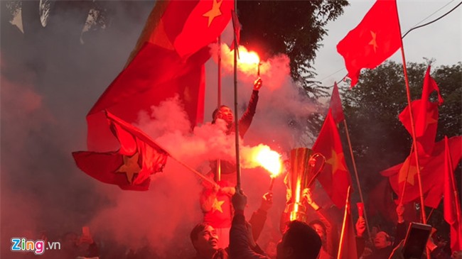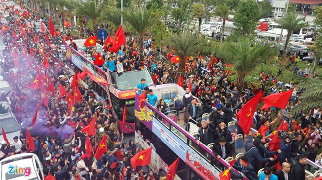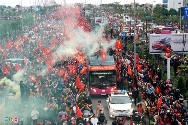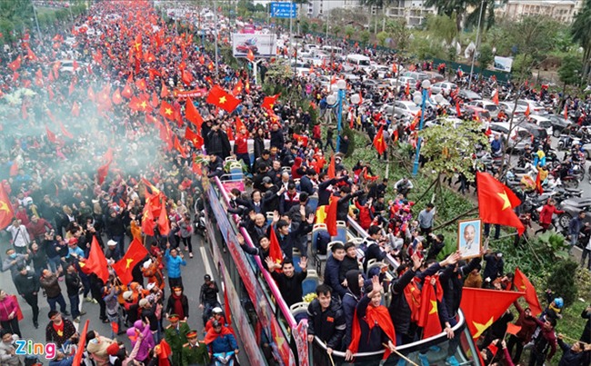 Vuợt qua cầu Nhật Tân, U23 Việt Nam đang tiến vào trung tâm TP Hà Nội. Chiếc xe buýt chở các cầu thủ đang ở trên đường Võ Chí Công. HLV Park Hang-seo vẫn không ngớt vẫy tay chào người hâm mộ. Ở phía dưới, hàng nghìn người vẫy cờ, đốt pháo sáng và hô vang "Việt Nam vô địch".