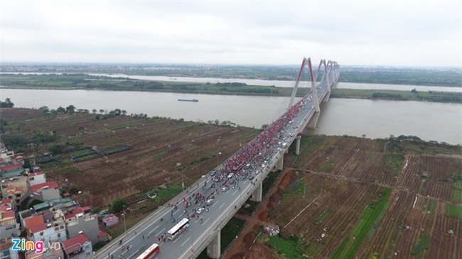 Đoàn xe diễu hành đang bị kẹt cứng và di chuyển rất chậm trên cầu Nhật Tân do có quá đông người hâm mộ dừng lại đây để vẫy chào các tuyển thủ U23 Việt Nam. Một cảnh tượng chưa từng có trên cầu Nhật Tân.