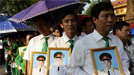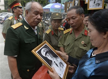 | Ở nơi khác, các cựu chiến binh giơ di ảnh của Đại tướng khi chờ tới lượt vào viếng người anh cả của quân đội nhân dân Việt Nam tại nhà riêng ở Hà Nội hôm 10/10. Ảnh: Reuters. |