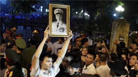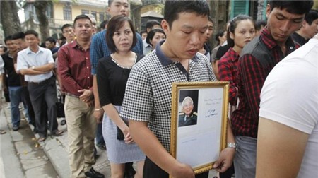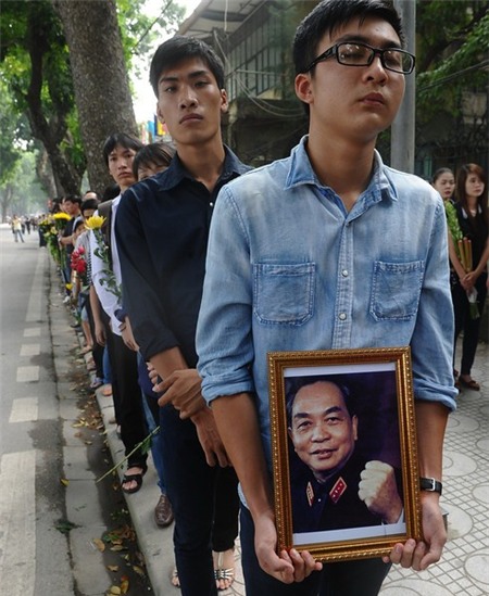 | Người thanh niên giơ cao di ảnh của Đại tướng trong lúc xếp hàng ở đường Hoàng Diệu vào tối 10/10. Ảnh: Reuters. |