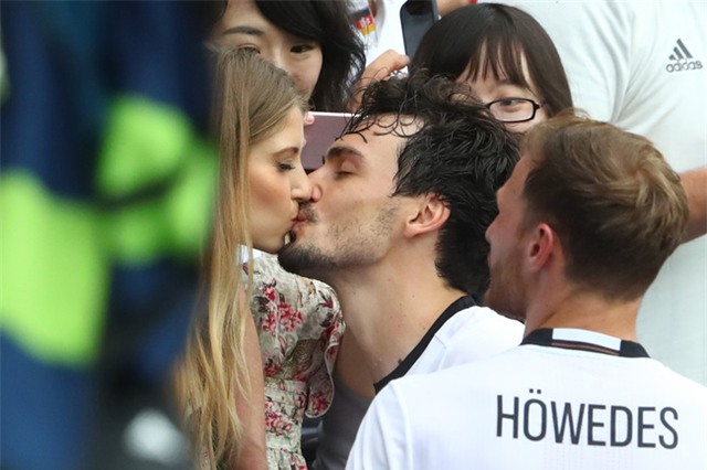 Các tuyển thủ Đức nổi tiếng với những nụ hôn và trong hình là khoảnh khắc lãng mạn của thủ thành Neuer với cô bạn gái Nina Weiss.