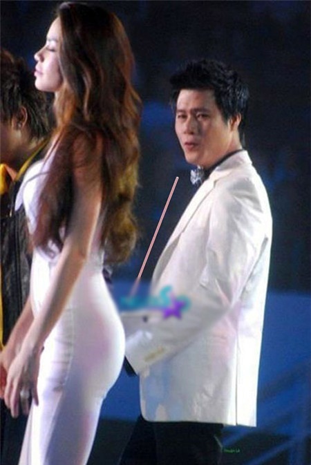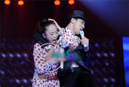 | Trấn Thành quá "phiêu" với ca khúc trên sân khấu nên không biết bàn tay của mình đang "đụng chạm" vòng 1 của Đoan Trang. |