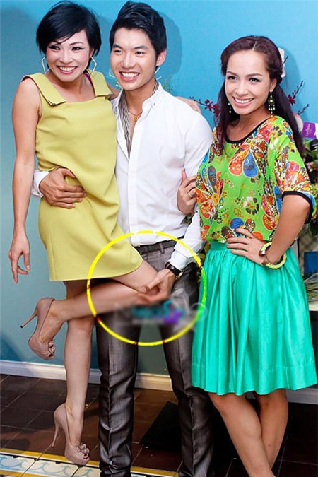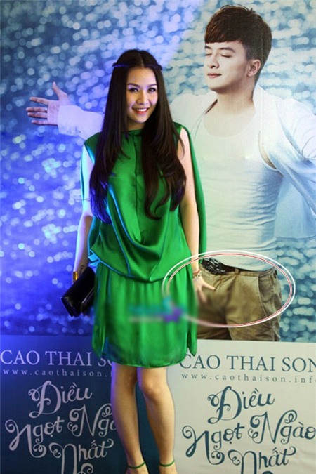 | Quế Vân tạo dáng, vô tình đặt tay đúng "chỗ hiểm" của Cao Thái Sơn trên... backdrop. |
