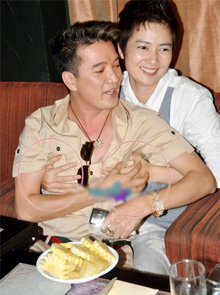 | Đàm Vĩnh Hưng mùi mẫn với Thúy Vinh, anh vô tư để Thúy Vinh "đụng chạm" ngực của mình. |