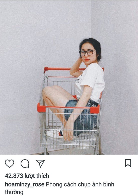 Khi hết chỗ để quậy và chụp hình thì Hòa Minzy tìm đến phụ kiện cực độc. Đó là xe đẩy siêu thị. |