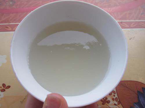 Đập trứng, tách lấy lòng trắng, cho vào bát rồi cho bột sắn vào bát đựng lòng trắng trứng, dùng thìa khuấy đều đến khi bột tan ra, thu được hỗn hợp đồng nhất (sánh mịn) thì dừng lại.