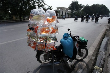 Hàng trăm con cá cảnh, hàng chục kg thức ăn cho cá nằm gọn trên chiếc xe gắn máy chạy khắp phố Thủ đô phục vụ người mê cá cảnh. |
