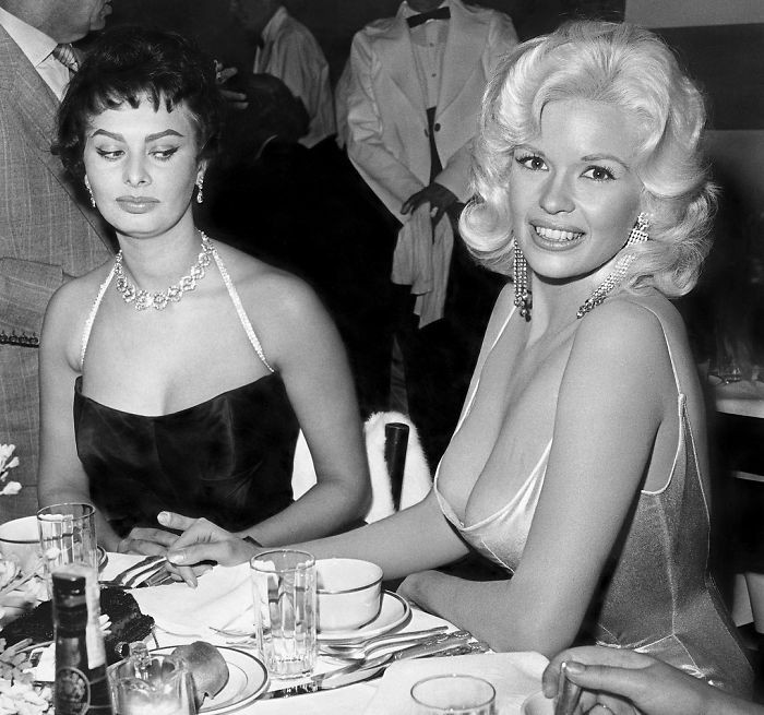 Bức ảnh huyền thoại khi Sophia Lauren "nhòm trộm" vòng 1 bốc lửa của Jayne Mansfield cũng được trang Velvet Coke đăng tải lại.