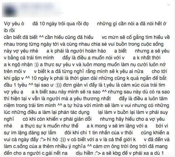 "10 ngày không phải là quãng thời gian dài nhưng cũng không quá ngắn để bắt đầu một tình yêu"; "Hôm nay là ngày đầu tiên 2 vợ chồng mình bắt đầu yêu thương nhau (...), với anh một ngày vừa rồi rất rất đặc biệt vì cớ vợ, đôi khi anh hay nghĩ lung tung, hay lo vu vơ sợ nhiều điều, nhưng anh hiểu rằng đơn giản vợ chồng mình yêu nhau, tin tưởng nhau". - một phần rất nhỏ được trích trong những "bức thư tình" của các bạn trẻ. Một bức thư kỉ niệm tình yêu 1 ngày, một bức thư viết để kỉ niệm tình yêu 10 ngày. Hai bức thư này đều được đăng tải trên 1 tài khoản Facebook có tên B.T.A, và dành tặng cho... 2 cô gái khác nhau, chỉ trong một thời gian rất ngắn. Thật... không biết phải bình luận gì.