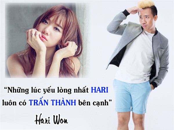 đàn ông tốt. Với bà xã Hari Won, Trấn Thành là người "cần là có mặt". "Những lúc yếu lòng nhất, Hari luôn có Trấn Thành bên cạnh", nữ ca sĩ thổ lộ.