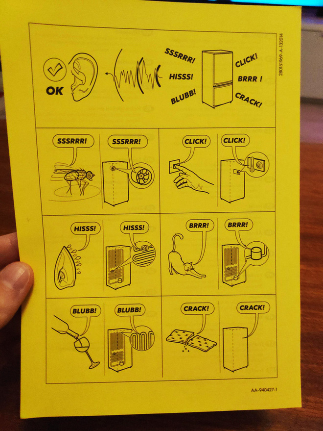 Tờ giấy này đi kèm tủ lạnh, báo cho người sử dụng biết về những tiếng động có thể phát sinh lúc thiết bị hoạt động. Một sự chăm chút tỉ mỉ từ phía nhà sản xuất.