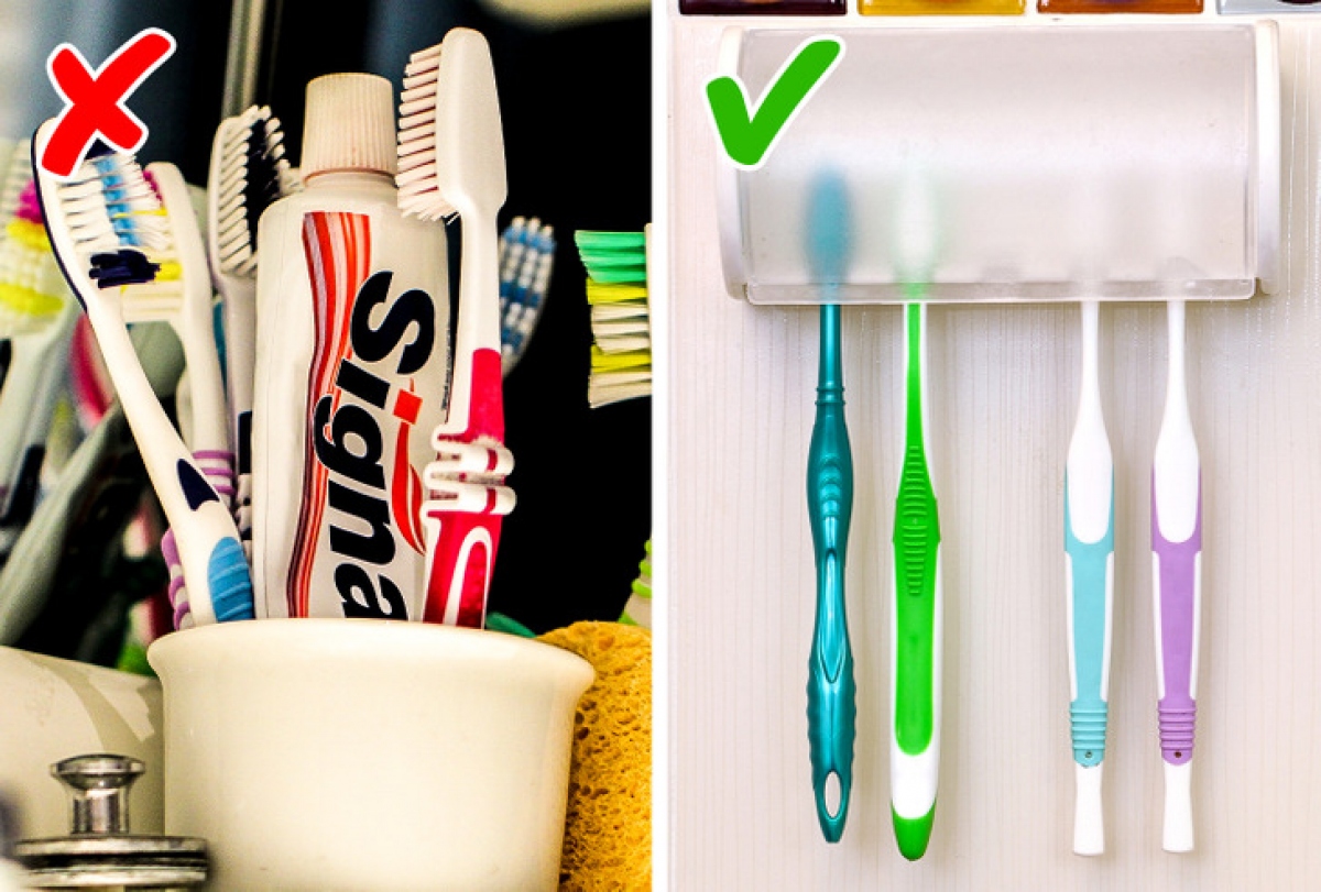Đây là lý do tại sao bạn nên thường xuyên rửa và khử trùng. Bên cạnh đó, nó để lại dấu vết trên bồn rửa mà bạn cũng cần làm sạch. Không nên để bàn chải đánh răng của tất cả các thành viên trong gia đình vào cùng một cốc để tránh lây nhiễm chéo.