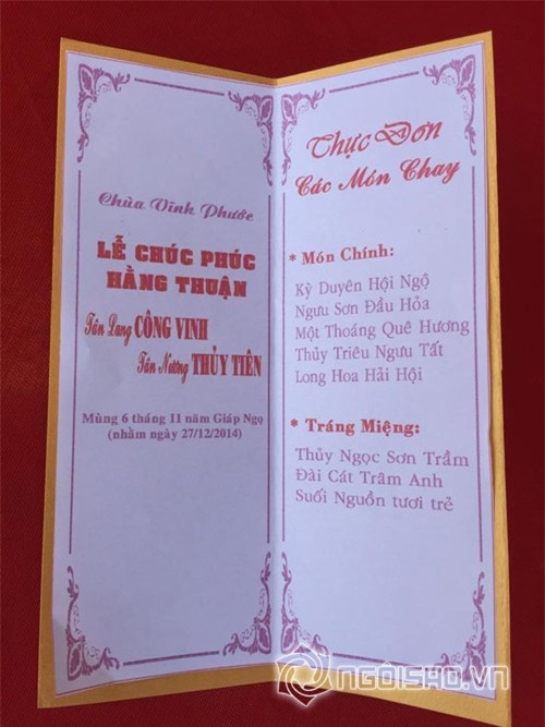 Cuối năm 2014, đám cưới của "cặp đôi vàng" Thủy Tiên - Công Vinh nhận được sự quan tâm của nhiều người. Trong ngày trọng đại, vợ chồng Thủy Tiên chọn món chay để đãi khách. Thực đơn trong đám cưới Thủy Tiên và Công Vinh gồm các món nghe rất lạ như: Kỳ duyên hội ngộ, một thoáng quê hương, suối nguồn tươi trẻ...