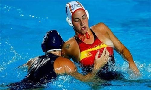 Nữ VĐV bóng ném nước bị đối thủ kéo tuột áo lộ ngực ra ngoài.