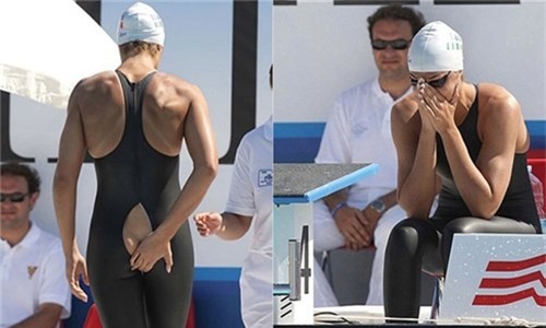 Nữ vận động viên người Ý Flavia xấu hổ khi trang phục bơi rách đúng chỗ không nên rách.