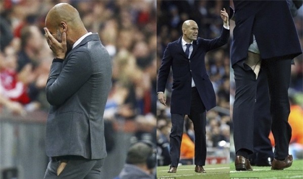 Hai HLV bóng đá nổi tiếng Zidane và Pep Guardiola với sự cố rách quần khi đang chỉ đạo trên sân.