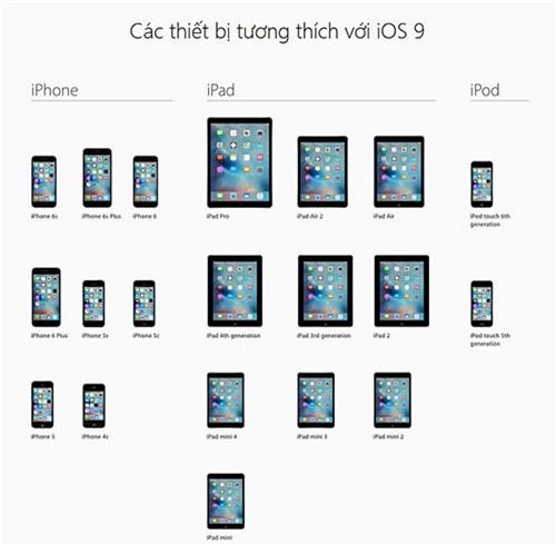 Tất cả các thiết bị hỗ trợ cập nhật lên iOS 8 đều có thể nâng cấp lên iOS 9, bạn đọc có thể kiểm tra phiên bản iOS mà mình đang sử dụng bằng cách vào phần Cài đặt -> Cài đặt chung -> Giới thiệu, rồi xem phần Phiên bản.