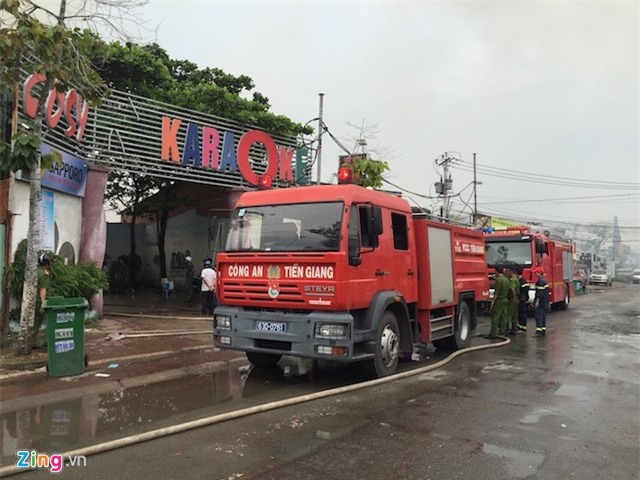 | Quán karaoke Cosy tại đường Lê Văn Phẩm (phường 5, TP Mỹ Tho, Tiền Giang) xảy ra cháy vào khoảng 14h chiều 12/10. Đây cũng là một trong những quán karaoke có quy mô lớn nhất TP Mỹ Tho và tỉnh Tiền Giang. Nhiều nhân chứng có mặt tại hiện trường cho biết thời điểm xảy cháy có một tiếng nổ lớn như chập điện. Khói và lửa bốc lên ngùn ngụt từ phòng hát karaoke. Nhiều thực khách đang ca hát, ăn uống trong quán hốt hoảng tháo chạy ra ngoài. |