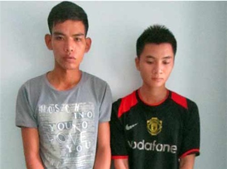 Hai đối tượng Nguyễn Doãn Tấn và Nguyễn Tiến Thuận tại cơ quan công an. |