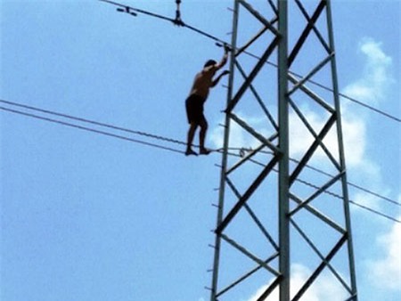 Nam thanh niên còn “diễn” màn đi trên dây điện cao thế 110kV, trước khi leo lên đỉnh trụ điện (cách mặt đất khoảng 40 mét) và ngồi tại đây. Lực lượng chức năng buộc phải cắt điện và dùng thang cứu hộ giải cứu nam thanh niên.