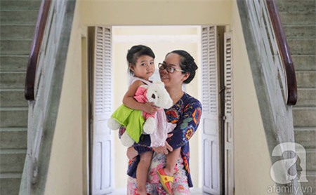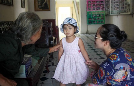 Bé Ngọc được mẹ nuôi cùng bà ngoại động viên cho bớt rụt rè. |