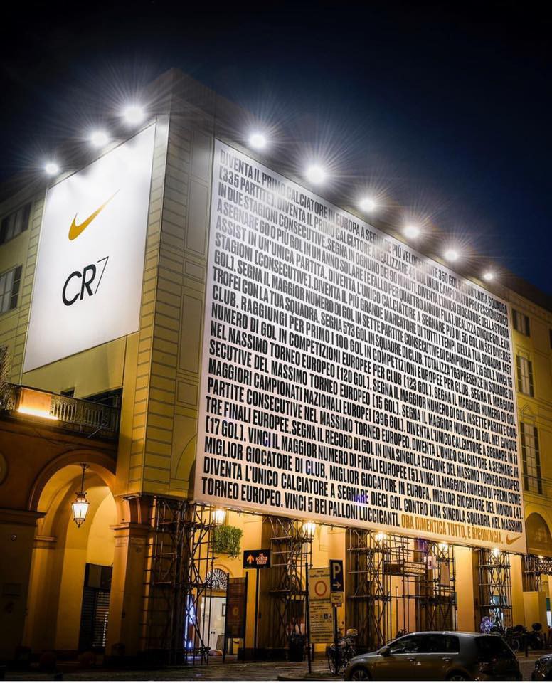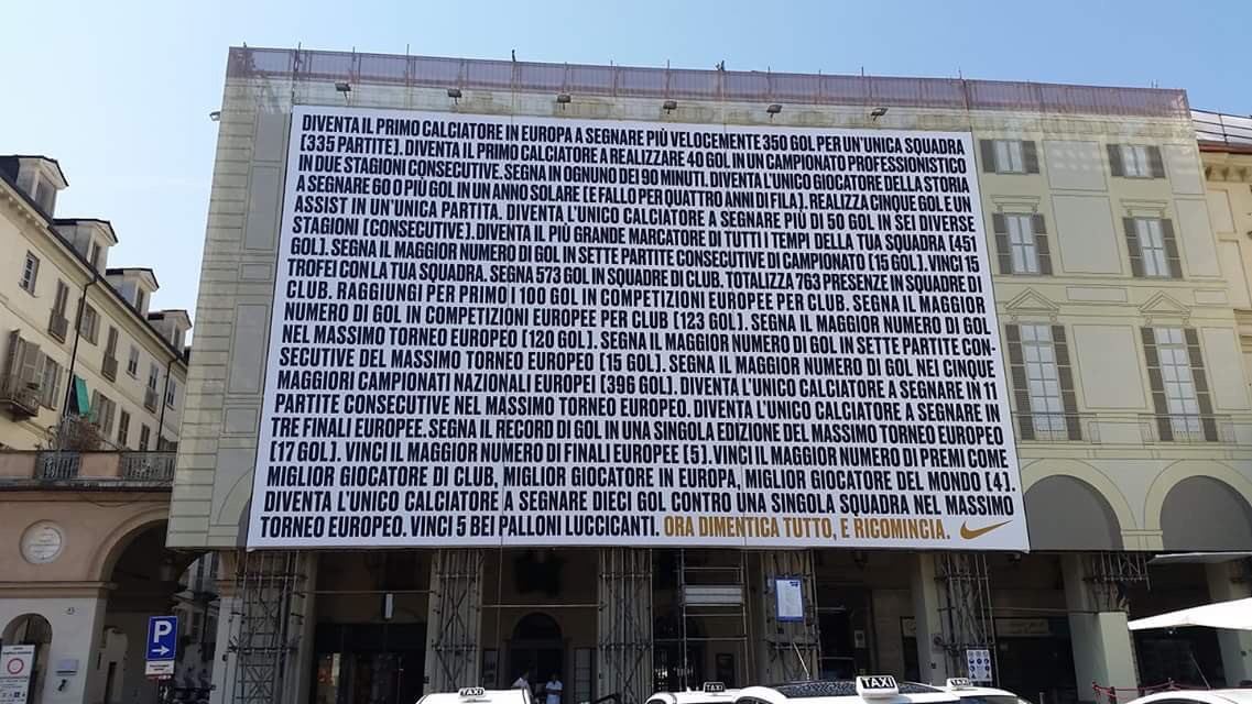 Vào tuần trước, thương hiệu đình đám Nike đã treo một biển quảng cáo to đùng, dày đặc chữ trước một cửa hàng tại thành phố Turin, Ý, nhằm kỉ niệm một khởi đầu mới của Cristiano Ronaldo tại nước này.