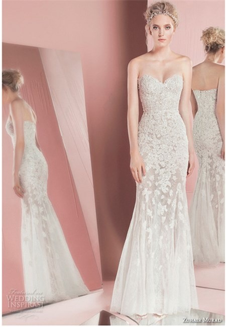 Thiết kế của Zuhair Murad thoạt nhiên ghi điểm nhờ cách sử dụng chất liệu vô cùng cao cấp. Các mẫu ren thêu đính sắc sảo, uốn lượn uyển chuyển đẹp như các tác phẩm nghệ thuật. Lụa organza hay lớp vải lưới tulle đều là loại thượng hạng nhất. Chất liệu hoàn hảo tạo cảm giác mượt mà nhưng vẫn rất đứng dáng, tôn vinh được đường nét đẹp trên cơ thể của các cô dâu.