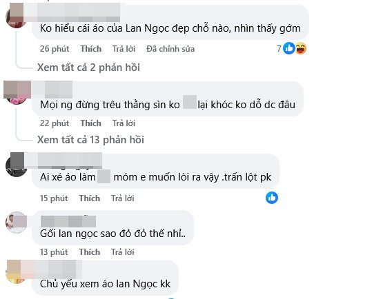Phía dưới loạt clip, netizen để lại bình luận: "Không hiểu áo Lan Ngọc đẹp chỗ nào, nhìn thấy gớm", "Đẹp mà cái áo dị ứng quá", "Ai xé áo Lan Ngọc vậy"...