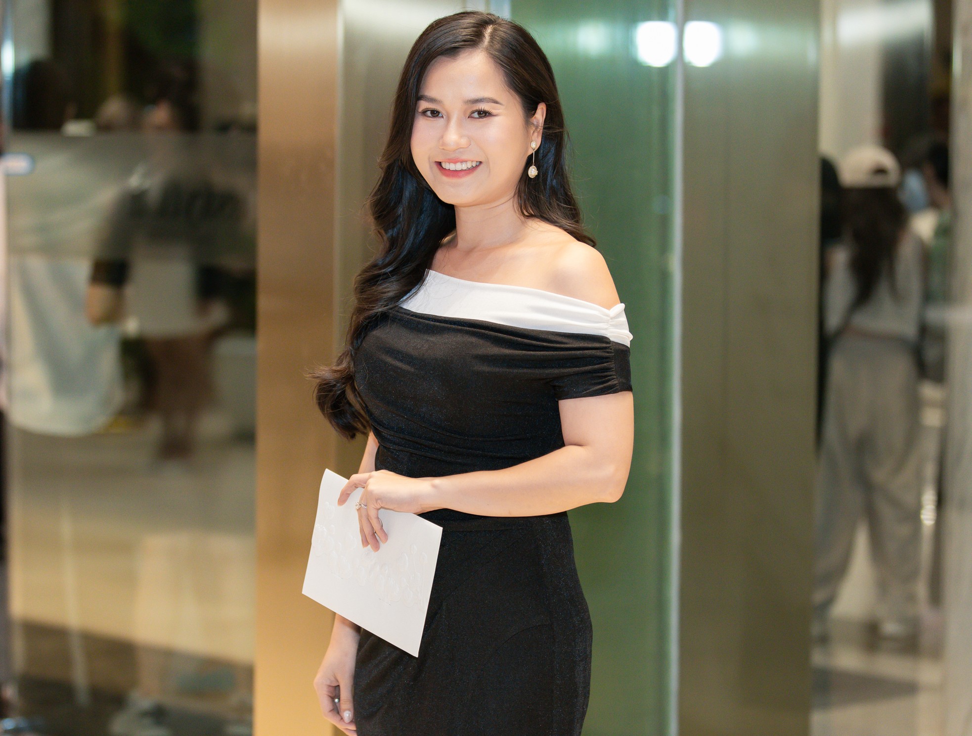 Lâm Vỹ Dạ mặc thanh lịch đến ăn cưới Midu. Cô trang điểm nhẹ, chọn thiết kế vai trễ làm điểm nhấn. |