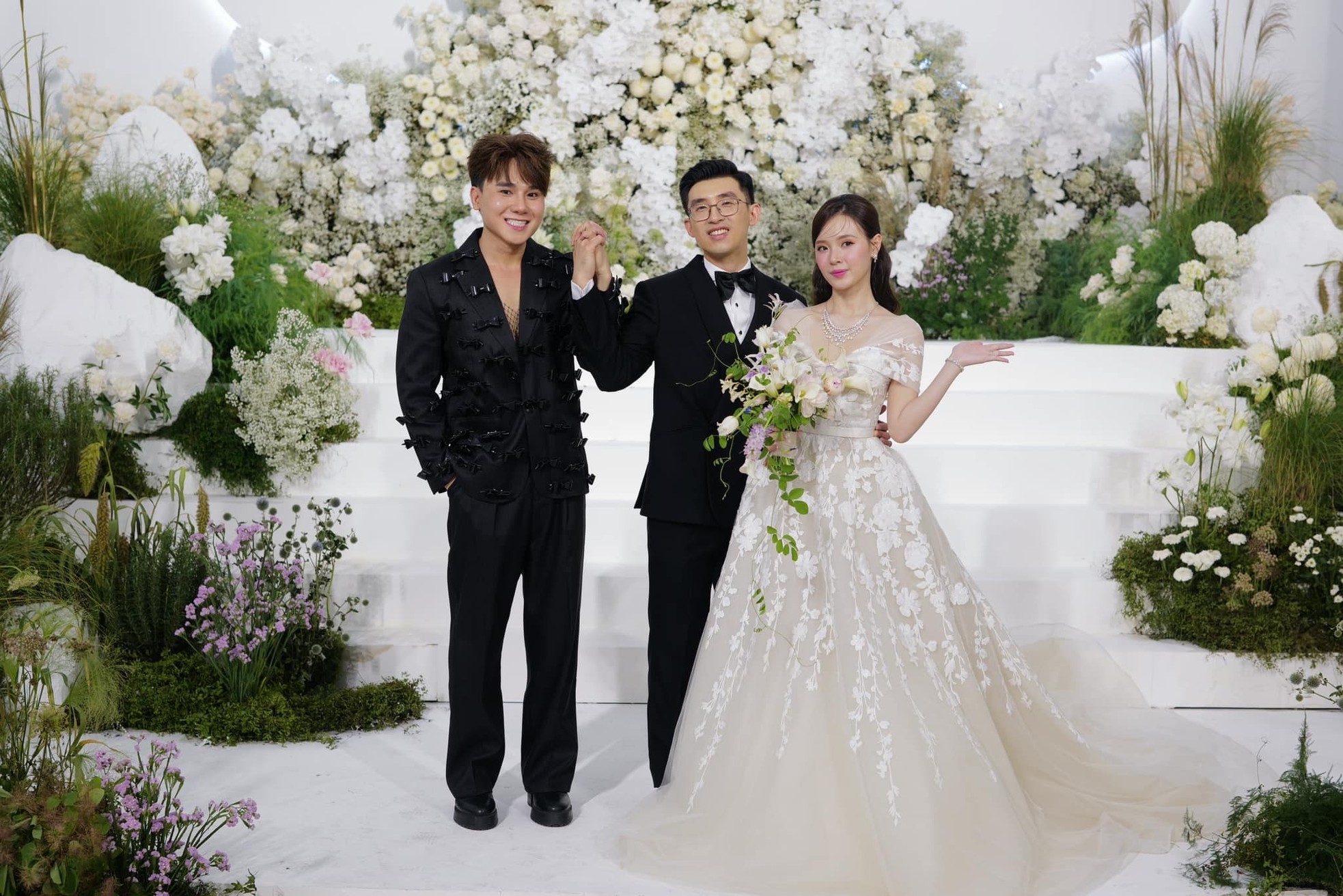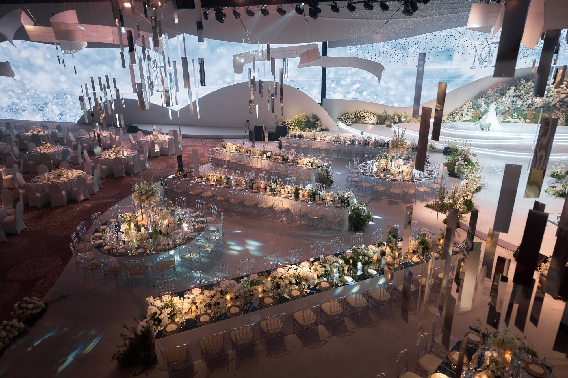 Bên trong nơi diễn ra hôn lễ giữa Midu và Minh Đạt. Sân khấu được lên ý tưởng, chuẩn bị trong 6 tháng và mất 4 ngày để hoàn thiện. Theo Tiền Phong