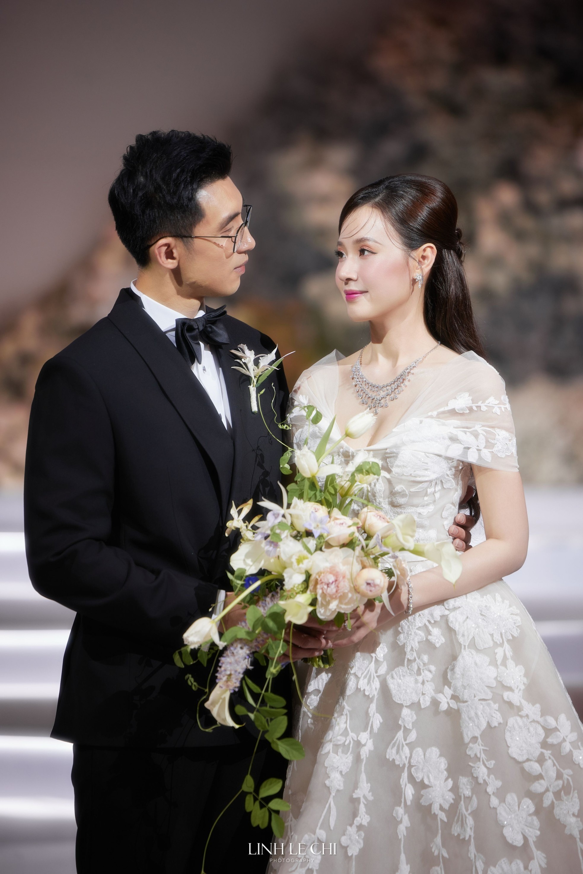 Trước giờ diễn ra hôn lễ, Midu tung ảnh cùng chú rể. Trang phục cưới chất liệu sheer in 3D nổi bật được Midu đặt may đo riêng từ thương hiệu thời trang đến từ Pháp. |