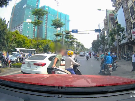 Không còn cách khác, người đàn ông đã phải giật lấy chiếc điện thoại trên tay "ninja", đẩy chiếc xe máy đi, nhấc bổng đuôi xe, đồng thời lôi cả người phụ nữ và chiếc xe vào lề đường.