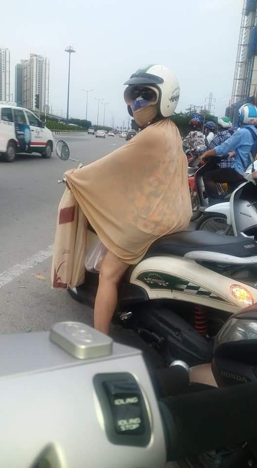 Tuy nhiên, điều này cũng dễ hiểu, bởi phụ nữ châu Á mà, ai chẳng sợ nắng làm đen da. Nhưng mà sợ nắng để nỗi quấn cả tấm vải màu da, tạo thành kiểu thời trang áo cánh dơi như chị gái trong hai bức ảnh dưới đây thì có vẻ hơi quá lố và gây cười cho những ai vô tình nhìn thấy.