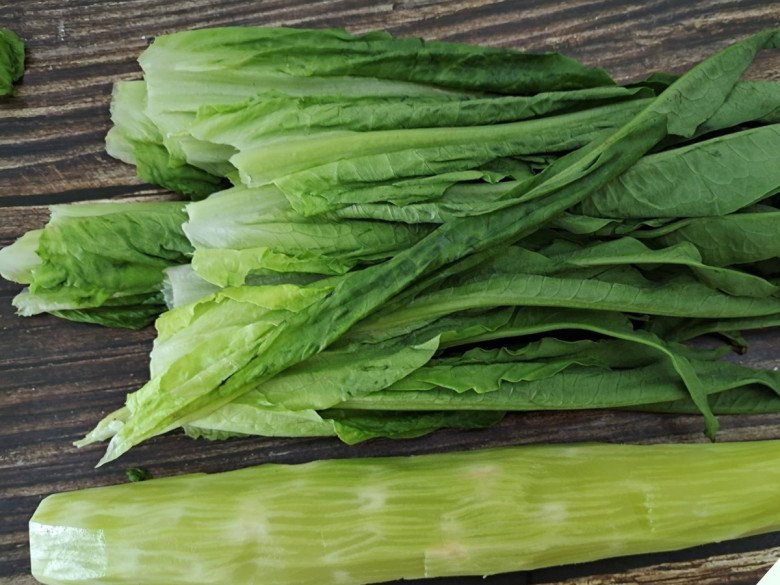 1. Rau diếp rửa sạch, tách rời lá và thân rồi thái thành từng khúc vừa ăn. Với thân rau diếp, bạn gọt bỏ vỏ già, thái miếng mỏng.