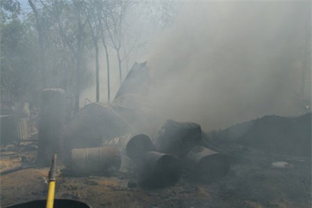 Tại hiện trường, kho phế liệu bị ngọn lửa thiêu rụi, bên trong chứa hàng trăm thùng phuy bị nổ tung do sức nóng từ ngọn lửa, nhiều phế liệu như vải, bao tải, bạt… bị cháy đen.