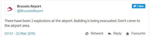 Người phát ngôn của sân bay, Anke Fransen, cho biết: "Đã có 2 vụ nổ lớn xảy ra ở ngoài ga khởi hàng. Lực lượng cứu thương đã xuất hiện ngay lập tức để giáp đỡ người bị nạn."