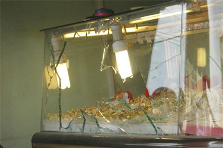 Tủ kính đựng vàng bị tên cướp đập vỡ. |