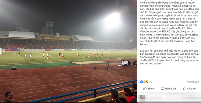 Bác ấy cũng đi xem cùng con nhỏ và có lẽ thấy mẹ già mặt đã xây xẩm rồi nên sợ nó ngất ra đấy thì phiền. 'Vàooooooo, 2 - 0 rồi 3 - 0. Mẹ già chả quan tâm mấy không, chỉ mong mau hết trận đấu để về. Bỗng nhiên không thấy bố và em Bon đâu? Chân bố hãy còn yếu sau phẫu thuật và em Bon thì nhỏ hơn".
