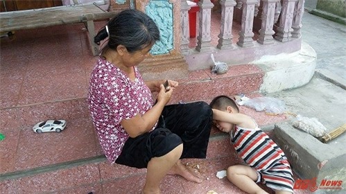 Em Nguyễn Hoàng Gia Bảo (6 tuổi), ở với bà Nguyễn Thị Trâm và ông Nguyễn Hữu Thọ, thôn Sông Hồng từ lúc mới một tuổi. Bố mẹ đi xuất khẩu lao động ở Đài Loan đến nay vẫn chưa có dịp về thăm Bảo lần nào.