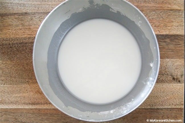 Hòa tan tinh bột khoai tây và nước trong một cái bát. Để yên trong khoảng 1 giờ cho đến khi tinh bột chìm xuống đáy, bỏ phần nước trong bên trên. Cho lòng trắng trứng vào và trộn đều lên.