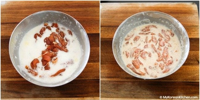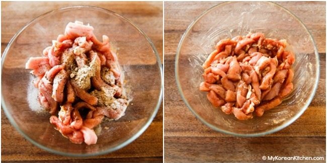 Trộn thịt lợn với 1 muỗng canh rượu gạo, 1 muỗng cà phê bột gừng (hoặc gừng băm nhỏ), 1 muỗng cà phê nước tương, 1 muỗng cà phê muối, một vài hạt tiêu đen rồi để vào ngăn mát tủ lạnh 30 phút để thịt ngấm gia vị.
