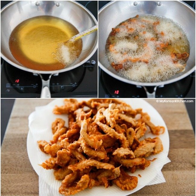 Đặt chảo lên bếp, đun nóng dầu ăn rồi cho thịt vào chiên vàng đều rồi vớt ra giấy thấm dầu.