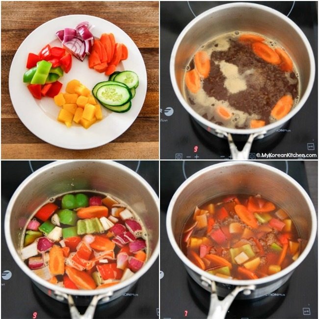 Trong một chảo khác, đổ nước sốt chua ngọt vào nồi. Đun sôi nước sốt trên lửa vừa cho đến khi sôi lên. Tiếp tục cho cà rốt vào nước sốt và đun sôi trong 1 phút. Thêm các rau quả còn lại và đun sôi nước sốt thêm 2 phút nữa. Khi nước sốt sánh lại thì tắt bếp.