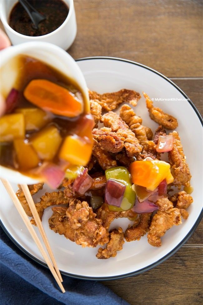 Cho thịt ra đĩa rồi múc nước sốt chua ngọt chan lên trên. Dùng nóng.